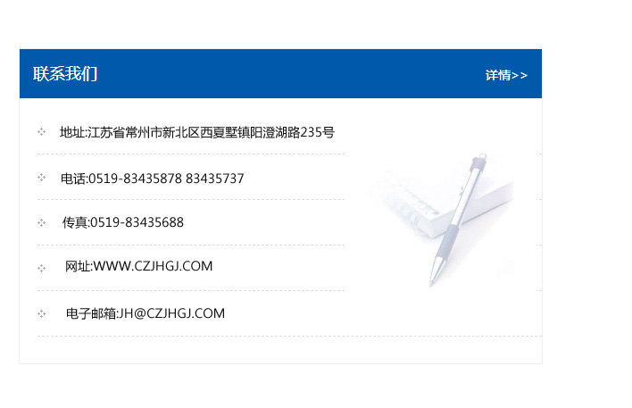 地址:常州市新北區友邦商務大廈1幢16、17層  電話:0519-85101652  傳真:0519-85112595  郵編:213022  網址:www_cz-jiayue_cn.zgldxny.com  郵箱:xiajifengaa@163.com
